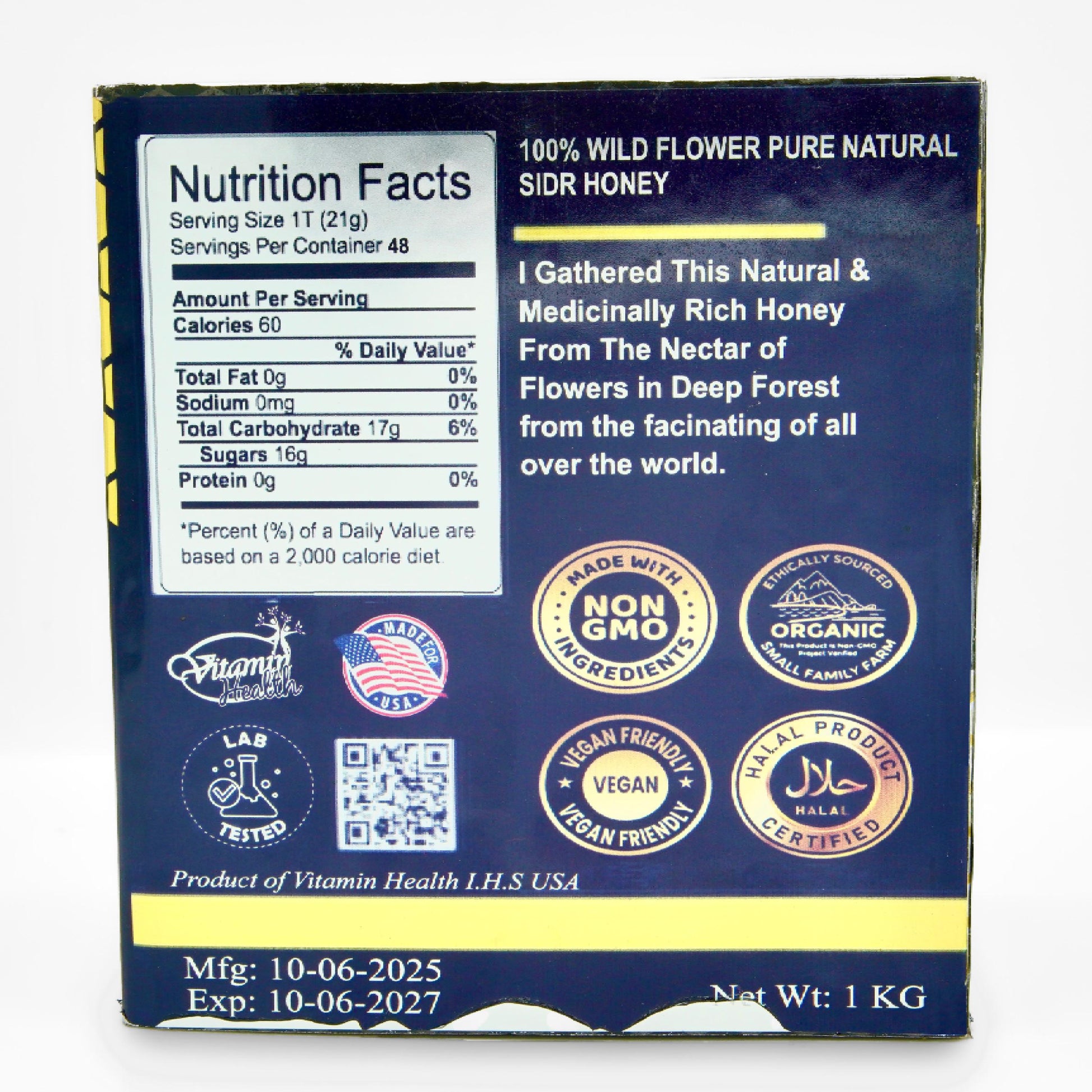 Experience nature’s finest gift with Wild Flower Sidr Pure Organic Honey—a rare, unadulterated honey harvested from the nectar of wild Sidr tree blossoms. Revered for centuries in Middle Eastern and Ayurvedic traditions, Sidr honey is known not only for its rich, luxurious taste but also for its exceptional health-boosting properties. Many brands claim purity, but our honey undergoes strict quality control and independent lab testing to ensure it’s 100% genuine Sidr honey. Each batch is harvested ethically, ensuring sustainability and the well-being of the bees.